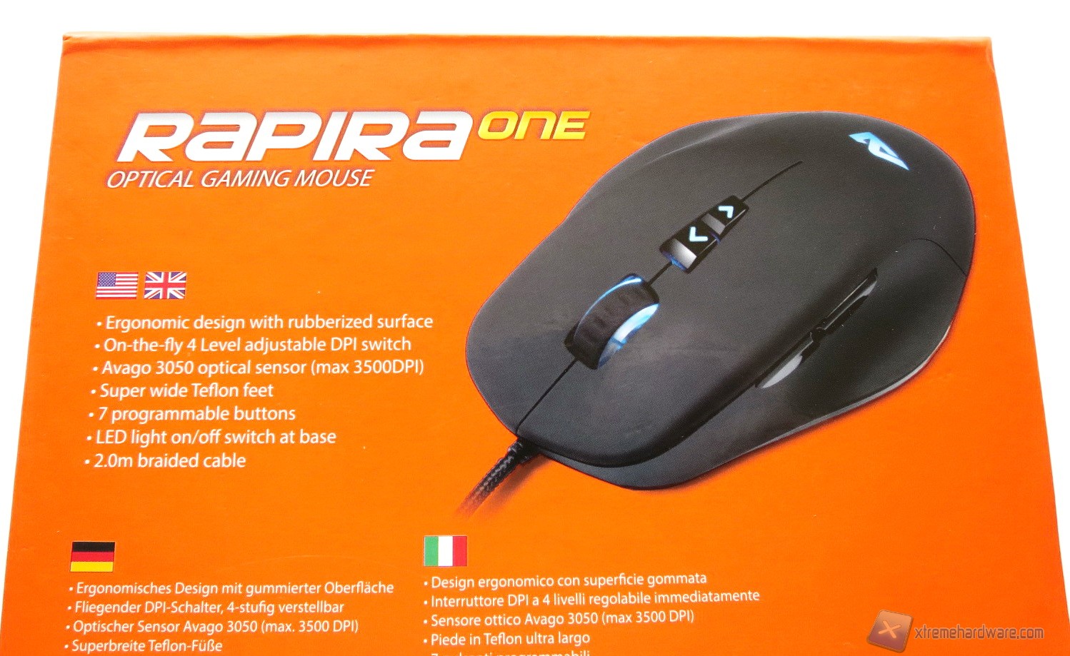 Nel retro invece sono presenti le caratteristiche principali del mouse riportateci in diverse lingue tra cui anche l’italiano.